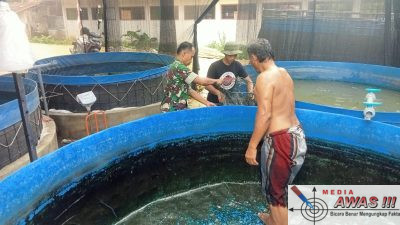 Babinsa Larangan Bantu Berikan Pakan Ternak Ikan Lele