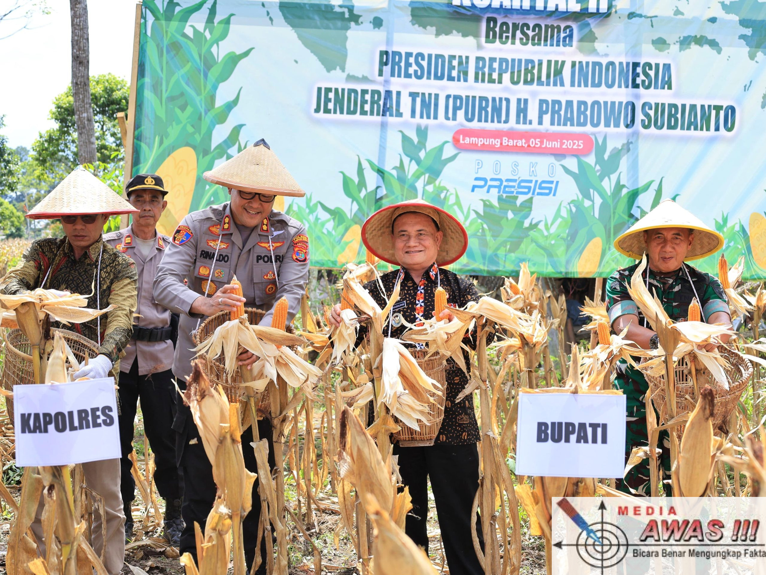 Mediaawas.com Wakil Bupati Lampung Barat Mad Hasnurin melaksanakan panen raya jagung serentak kuartal II dalam rangka swasembada pangan di Pemangku Tikoran, Pekon Sebarus, Kecamatan Balik Bukit, Kamis 05 Juni 2025.