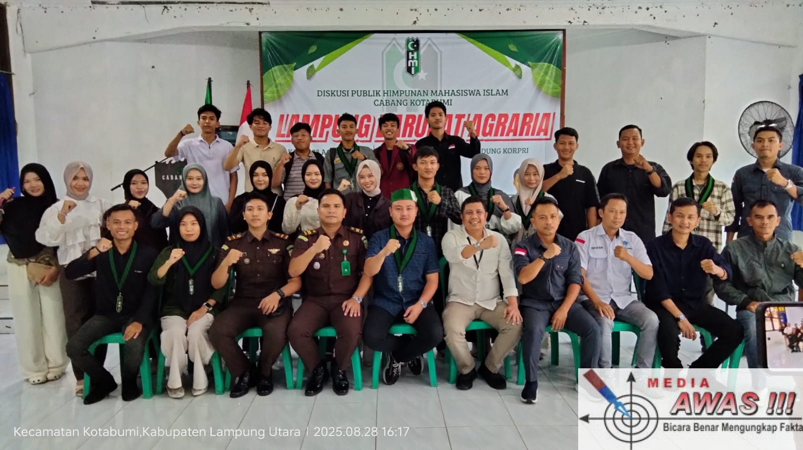 Mediaawas.com Lampung Utara – Organisasi kemahasiswaan Himpunan Mahasiswa Islam (HMI) cabang Kotabumi kabupaten Lampung Utara menggelar acara diskusi publik yang bertema “Lampung Darurat Agraria” di gedung Korpri pemerintahan setempat. Kamis (28 Agustus 2025).