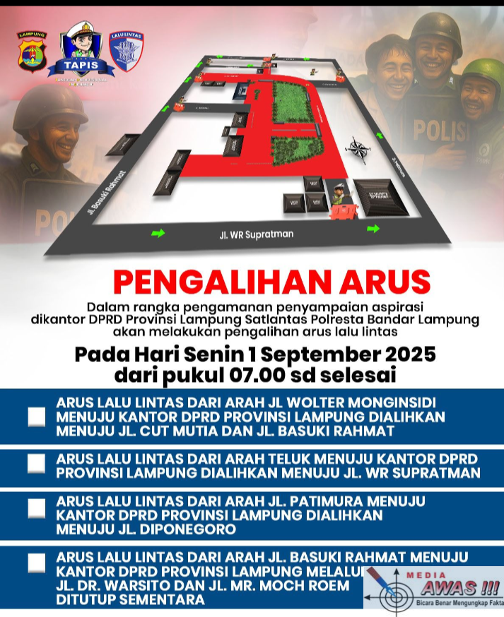 Lampung – Satuan Lalu Lintas (Satlantas) Polresta Bandar Lampung akan memberlakukan pengalihan arus lalu lintas pada Senin (1/9/2025) mulai pukul 07.00 WIB hingga selesai. Langkah ini dilakukan untuk mendukung kelancaran dan keamanan penyampaian aspirasi di Kantor DPRD Provinsi Lampung.