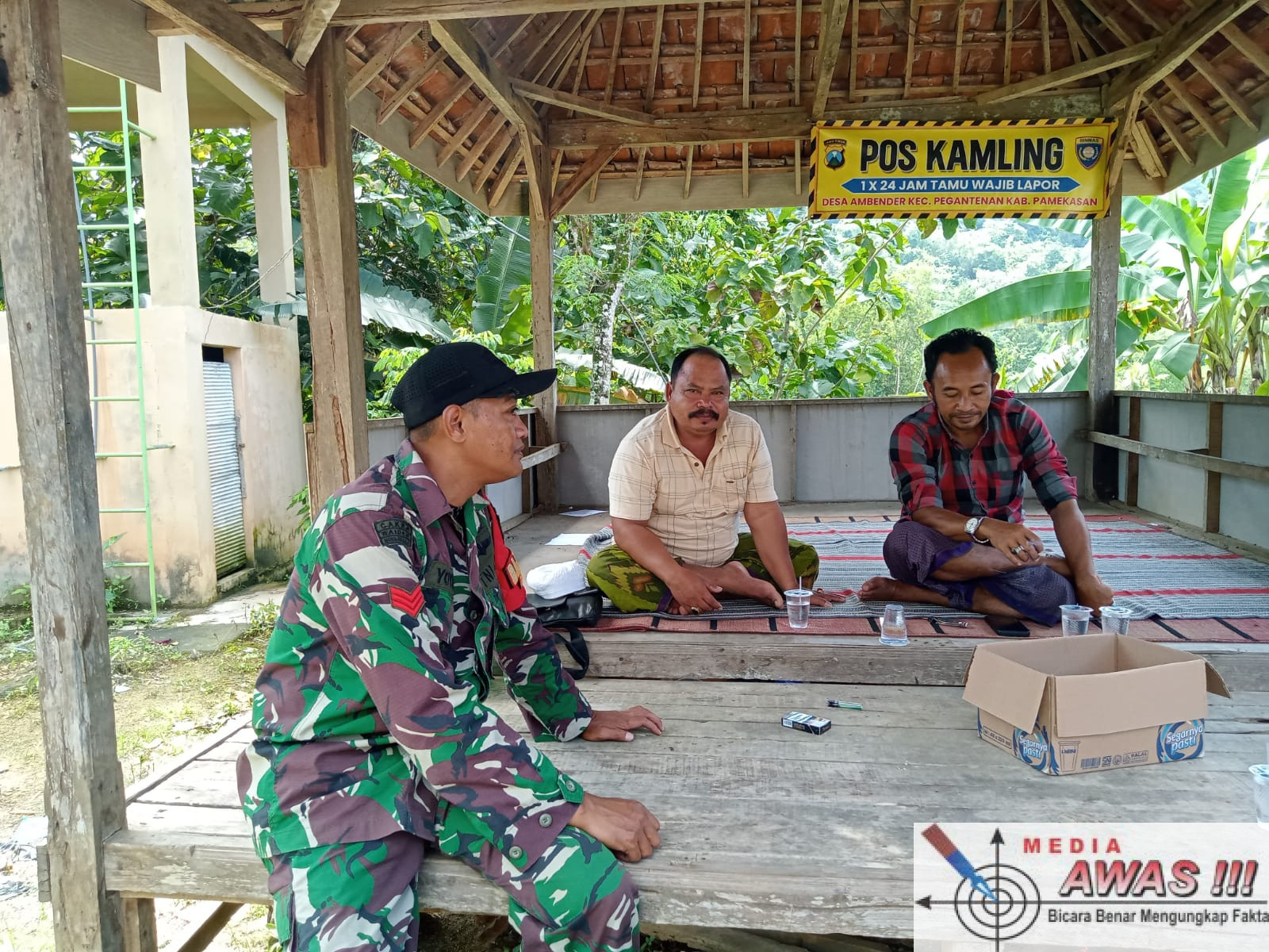 PAMEKASAN, Media Awas. Com– Babinsa Koramil 0826-07/Pegantenan, Kopka Yoyon Setyo Wibowo, melaksanakan kegiatan komunikasi sosial (Komsos) bersama tokoh masyarakat H. Mansur di Dusun Daleman, Desa Ambender, Kecamatan Pegantenan, Kabupaten Pamekasan.