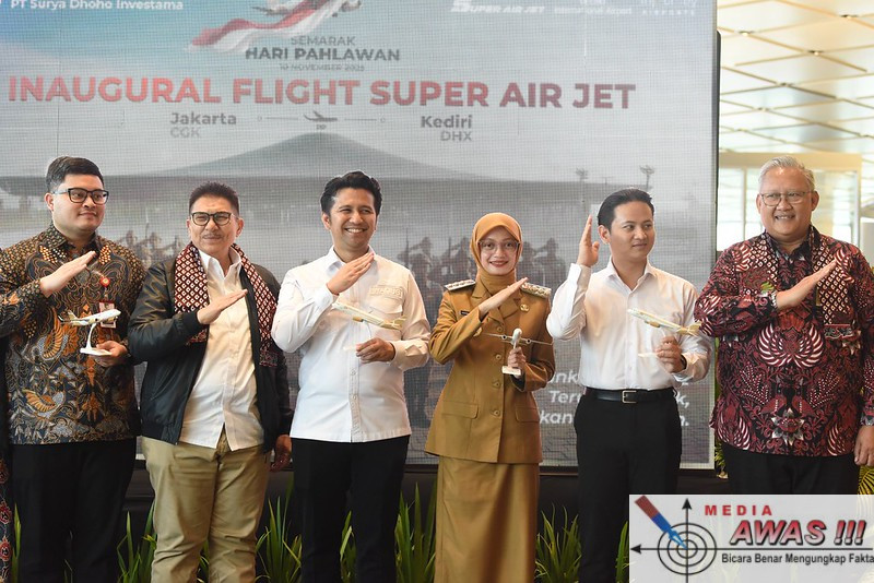MediaAwas.KEDIRI – Tepat di momentum Hari Pahlawan, Senin (10/11/2025), Bandara Dhoho Kediri resmi kembali membuka rute penerbangan Kediri–Jakarta dan sebaliknya. Penerbangan perdana ini dilayani oleh maskapai Super Air Jet. Wali Kota Kediri Vinanda Prameswati hadir langsung untuk menyaksikan inaugural flight di Bandara Dhoho Internasional Kediri.