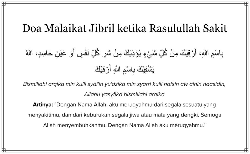 Dengan mengikuti ajaran dan teladan Nabi Muhammad SAW, umat Muslim percaya bahwa berdoa merupakan salah satu cara yang efektif dalam memohon kesembuhan dari Allah SWT. Berikut doanya: