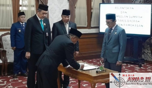 PAMEKASAN, Media Awas. Com- Bupati Pamekasan, Madura, Jawa Timur, Dr. KH. Kholilurrahman melantik dan mengambil sumpah Drs. Taufikurrachman, M.Si sebagai sekretaris daerah (Sekda) definitif di Peringgitan Dalam Pendopo Agung Ronggosukowati, Kamis (26/2/2026).
