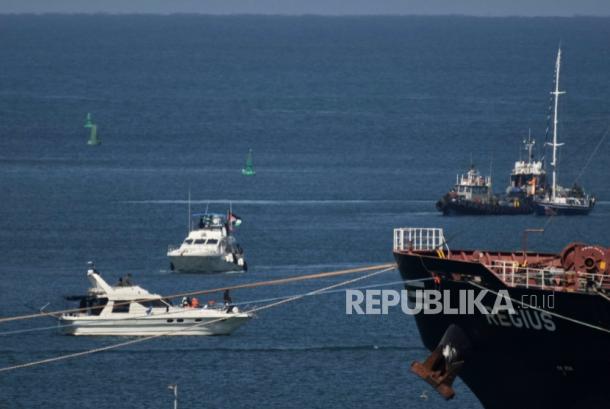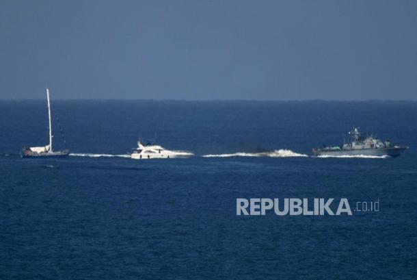 Kapal Angkatan Laut Israel menarik kapal dari Armada Sumud yang mereka bajak menuju pelabuhan Ashdod, Israel, Kamis 2 Oktober 2025. – (AP Photo/Leo Correa)