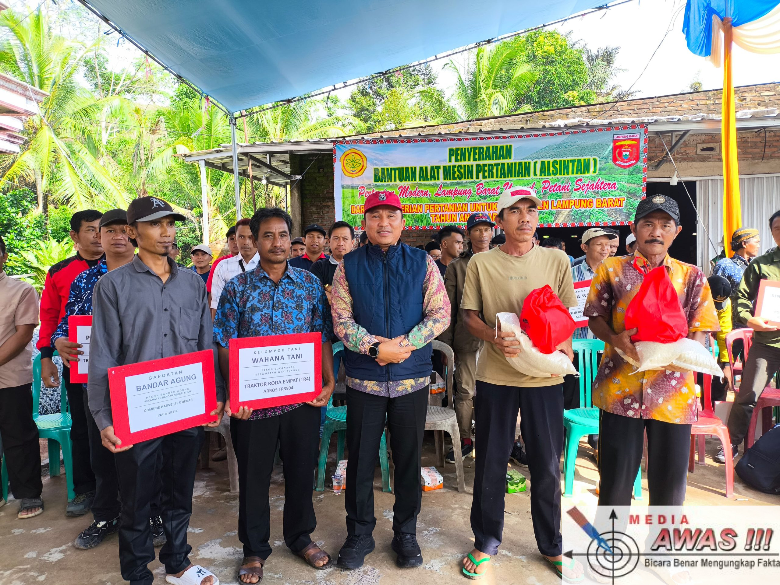 Mediaawas.com Upaya memperkuat ketahanan pangan terus dilakukan Pemerintah Kabupaten Lampung Barat. Bupati Lampung Barat H. Parosil Mabsus kembali menyalurkan bantuan alat dan mesin pertanian (Alsintan) kepada sejumlah kelompok tani dalam kegiatan Penyerahan Alsintan dan Penanaman Bibit Pohon Bersama BPC HIPMI, yang berlangsung di Pekon Bumi Hantatai, Kecamatan Bandar Negeri Suoh, Selasa (23/12/2025).