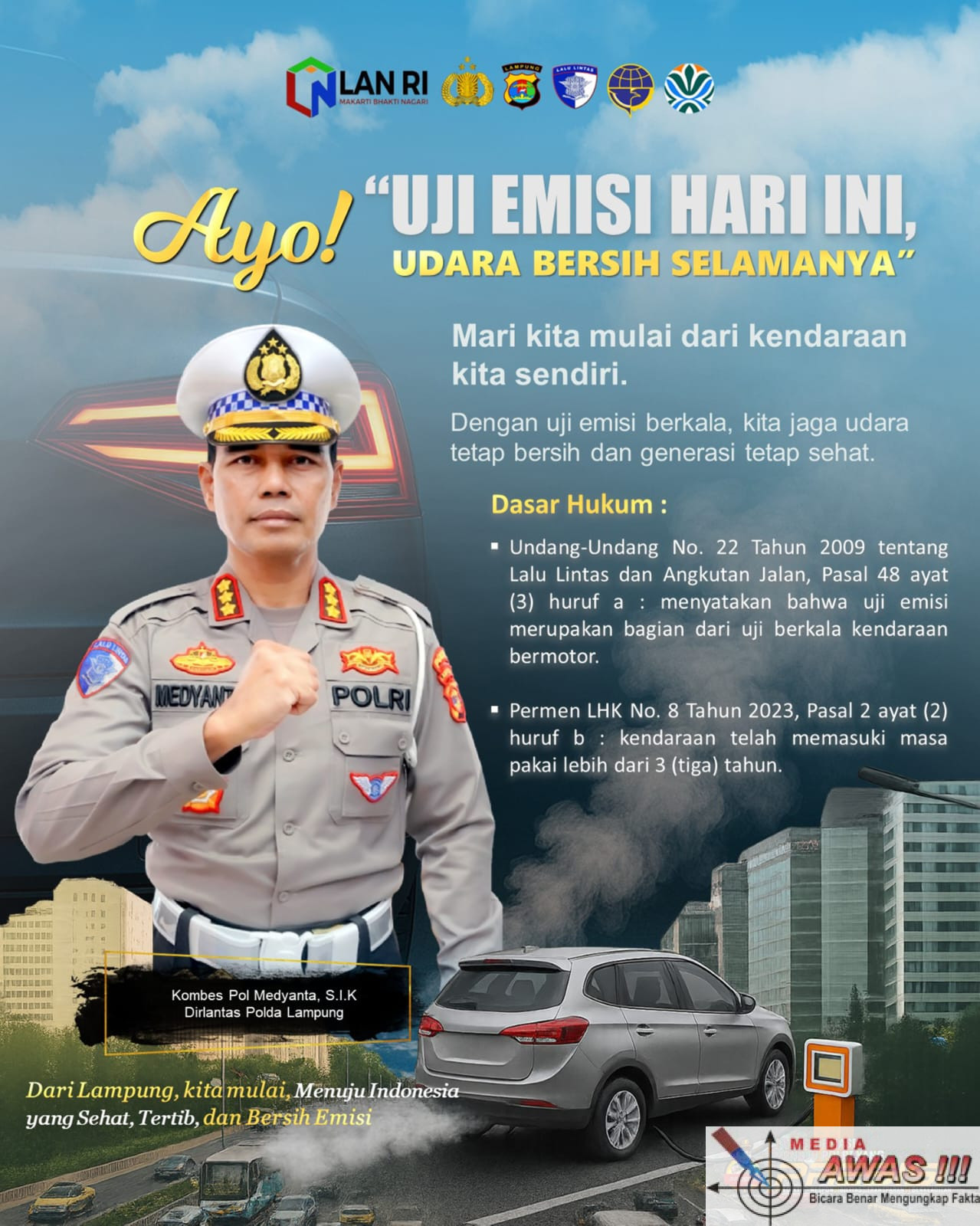 Dalam poster resmi yang dirilis Ditlantas Polda Lampung, Kombes Pol Medyanta menegaskan bahwa kendaraan bermotor merupakan salah satu kontributor utama pencemaran udara di wilayah perkotaan. Oleh karena itu, uji emisi secara berkala menjadi langkah nyata dalam menciptakan udara bersih dan menjaga kesehatan generasi masa depan.