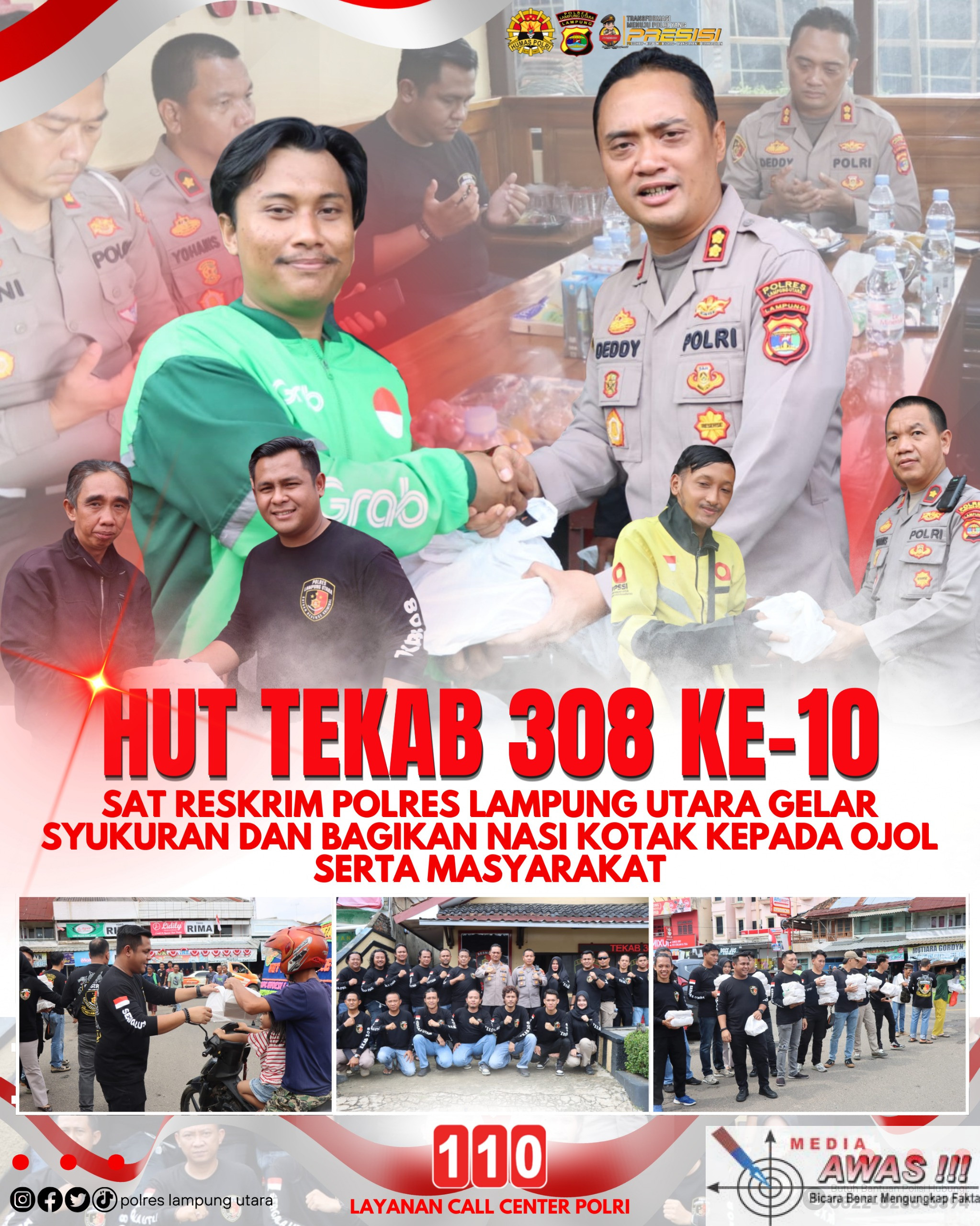 Tidak hanya menggelar syukuran, Sat Reskrim yang di pimpin langsung oleh Kapolres Lampung Utara AKBP Deddy Kurniawan di damping Waka Polres Kompol Yohanis dan Kasat Reskrim AKP Apfryyadi membagikan 308 kota nasi kepada ojol dan masyarakat.