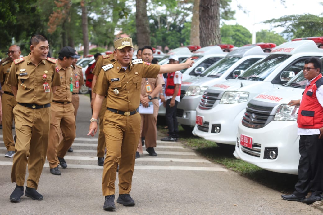 Bupati Lampung Barat Parosil Mabsus melakukan langsung pengecekan kesiapan dan kelengkapan puluhan ambulance bertempat di Pelataran Kantor Bupati setempat, Senin 10 Maret 2025.