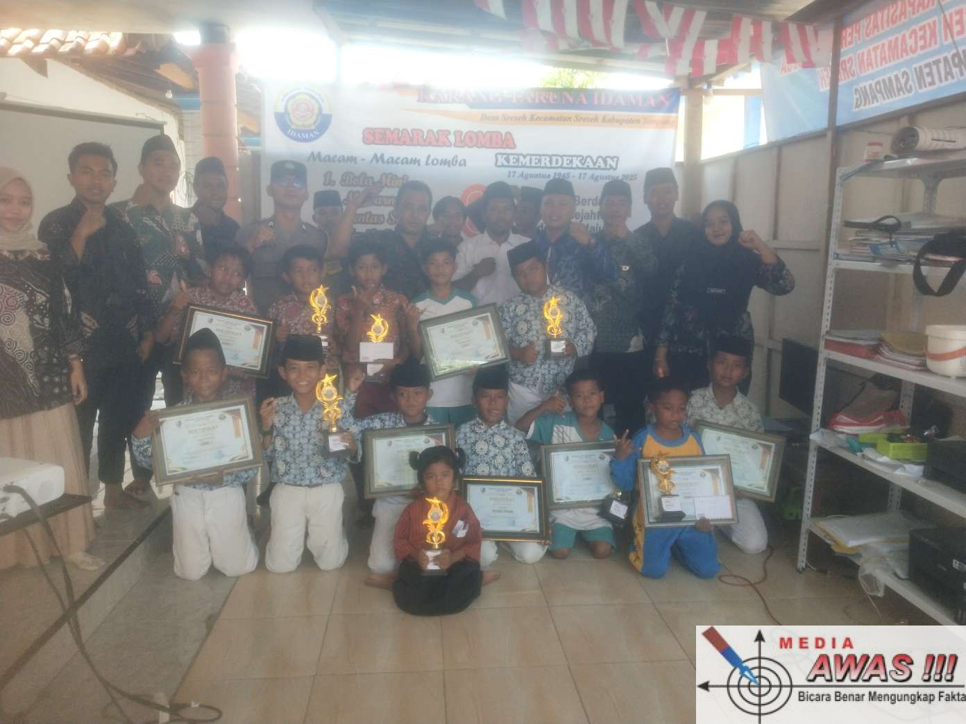 Caption: para pemenang lomba dalam rangka HUT RI ke 80, bersama pengurus karang taruna idaman, babinkamtibmas Sreseh, PJ kades Sreseh di balai desa Sreseh.( dok: Sholeh/ awas.com).