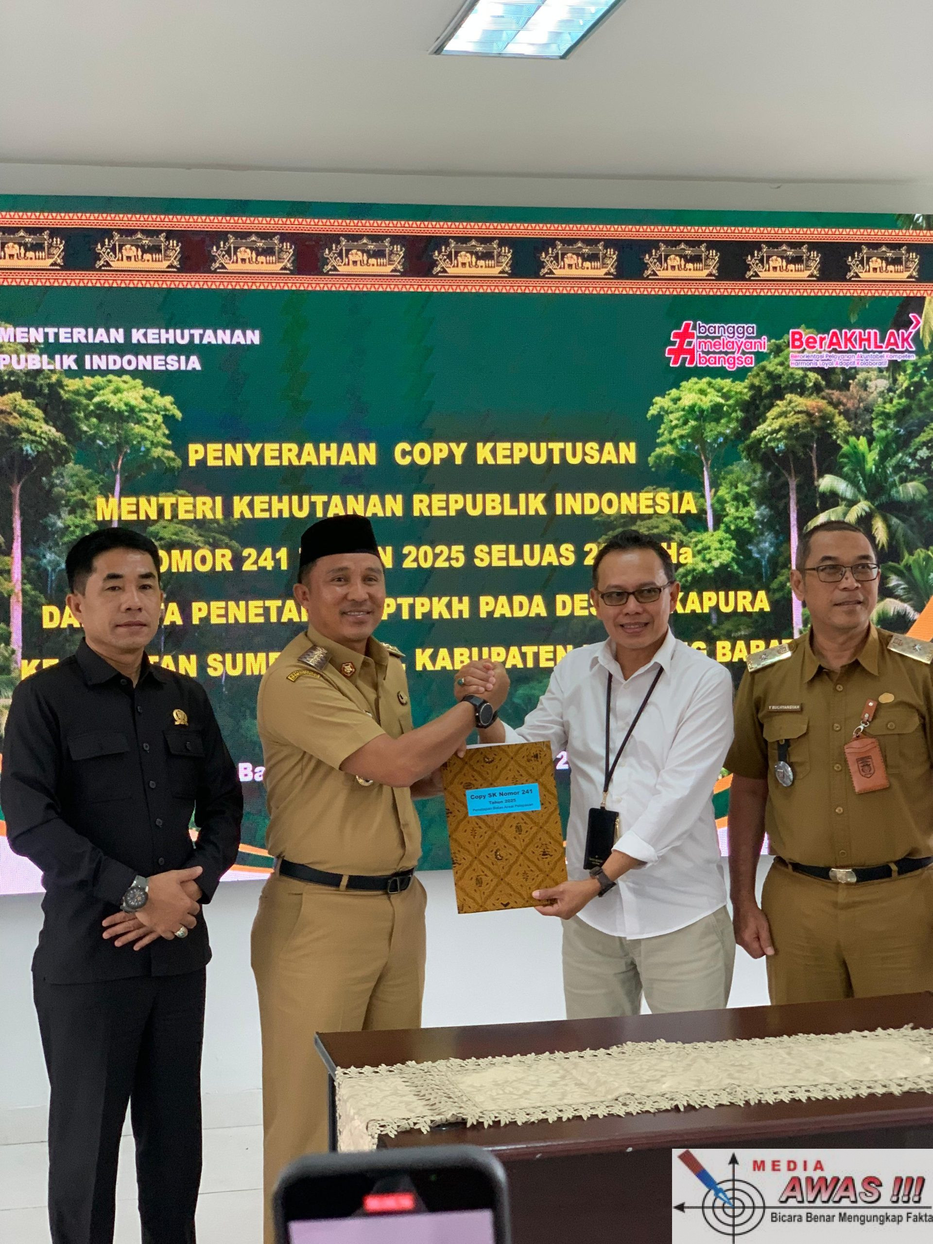 Mediaawas.com DISKOMINFO, LAMPUNG BARAT – Pemerintah Kabupaten Lampung Barat menerima salinan Keputusan Menteri Kehutanan Republik Indonesia Nomor 241 Tahun 2025 tentang penetapan batas areal pelepasan sebagian kawasan hutan produksi tetap, dalam rangka penyelesaian penguasaan tanah pada kawasan hutan (PPTPKH) Provinsi Lampung Tahap I untuk sumber objek reforma agraria (TORA).