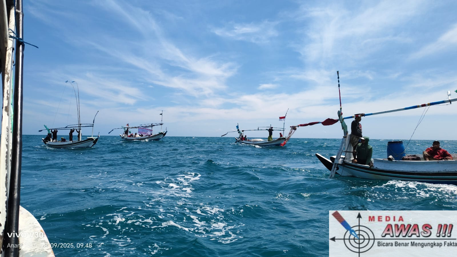 Sampang – awas.com – Puluhan perahu nelayan melaju ketengah laut di perairan Pantura, sebagai aksi protes dan tuntutan penolakan dari Persatuan Nelayan Pantura Madura( PNPM ) atas rencana dari Petronas bersama SKK Migas yang ingin melakukan exploirasi sumur migas di wilayah pantai Utara, Minggu (28/09/2025).