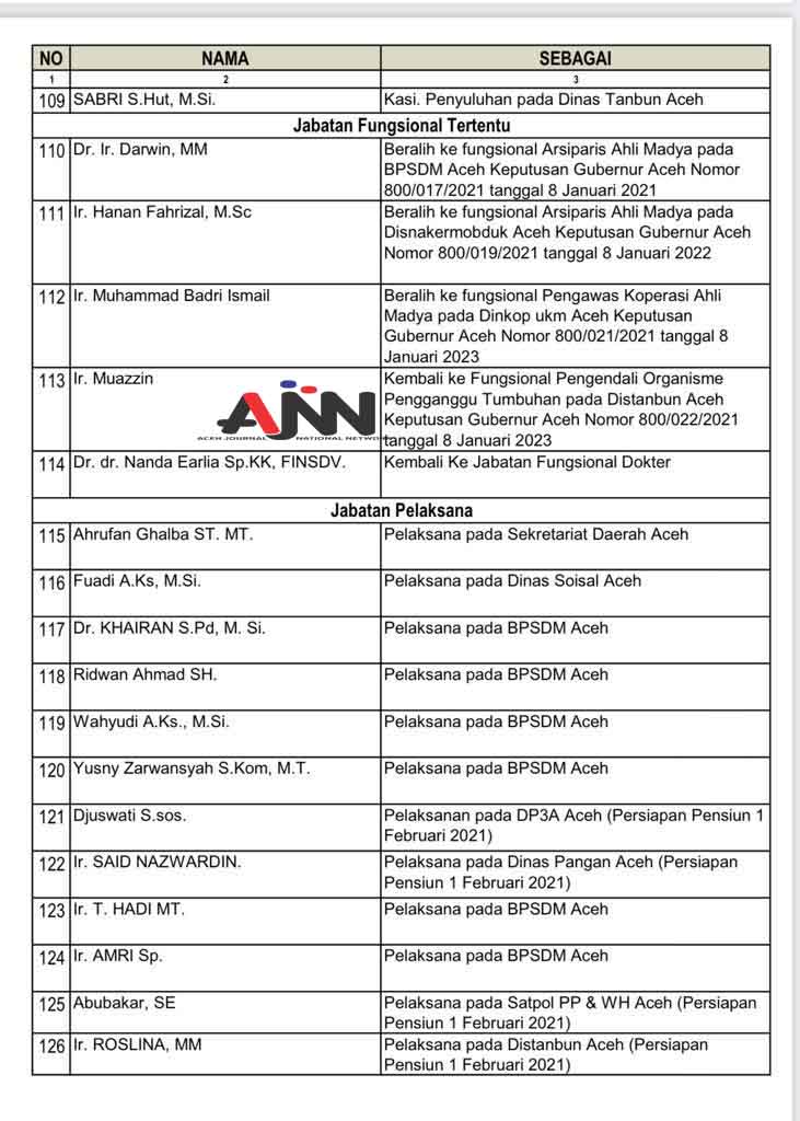 Pemerintah Aceh kembali melakukan pelantikan sejumlah pejabat eselon III dan IV di lingkungan pemerintahan. Sebanyak 290 pejabat yang dilantik tersebut terdiri dari 113 pejabat eselon III dan 177 pejabat eselon IV. Pelantikan ini dilakukan oleh Sekretaris Daerah (Sekda) Aceh, M Nasir, di Anjong Mon Mata Komplek Meuligoe Gubernur Aceh pada Jumat, 26 September 2025.