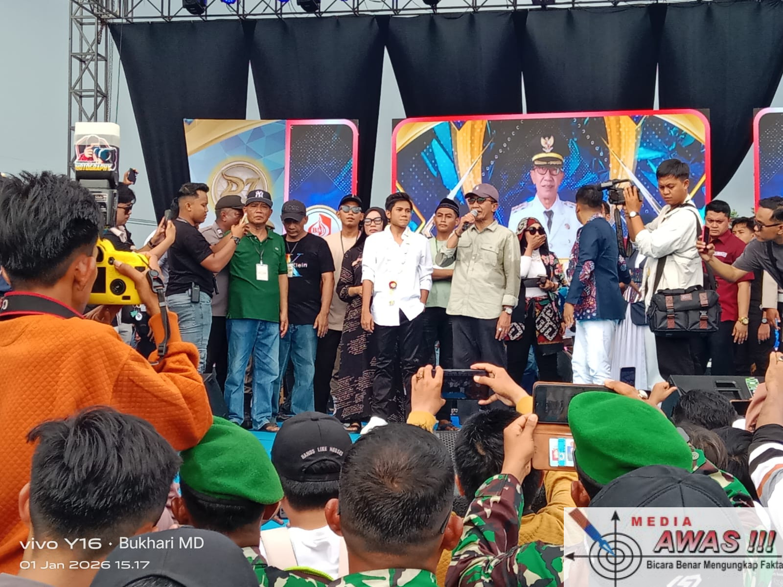 PAMEKASAN,Media Awas. Com– Konser penyambutan Ach. Valen Akbar, finalis dan Juara Dua ajang Dangdut Academy (DA) 7 Indosiar, digelar di Stadion Gelora Madura Ratu Pamelingan (SGMRP), Kabupaten Pamekasan, Kamis (1/1/2026) sore.